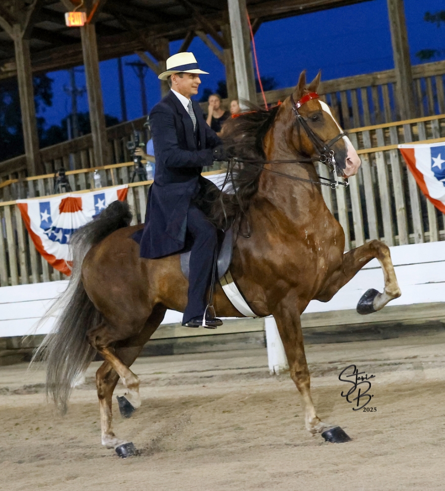 CONSIGNOR'S STATEMENT: Harrington Mill is going to be standout in the amateur or juvenile classes next year. His sire, the late multiple WGC sire Undulata's Nutcracker, needs no introduction as his pedigree and record speaks for itself. Harrington Mill's bottom side includes bloodlines such as WGC sire RWC I'm Lookin For You, WGC sire WCC CHCaramac and WGC sire WGC CHWill Shriver. It is no wonder this horse has the presence and ability everyone is looking for in a show horse! With wins and reserves in 2025 at Shelby County Fair and Shelby County Summer Classic, he is ready to continue his winning ways with a new rider in 2026.